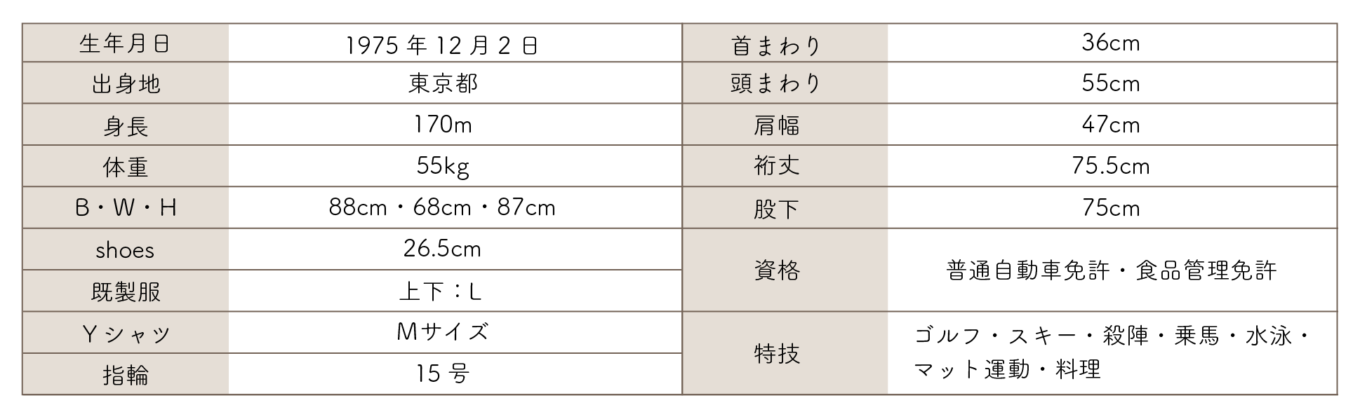 高校時代にゴルフ部に所属し、運動能力は高く、乗馬や殺陣も得意とする。